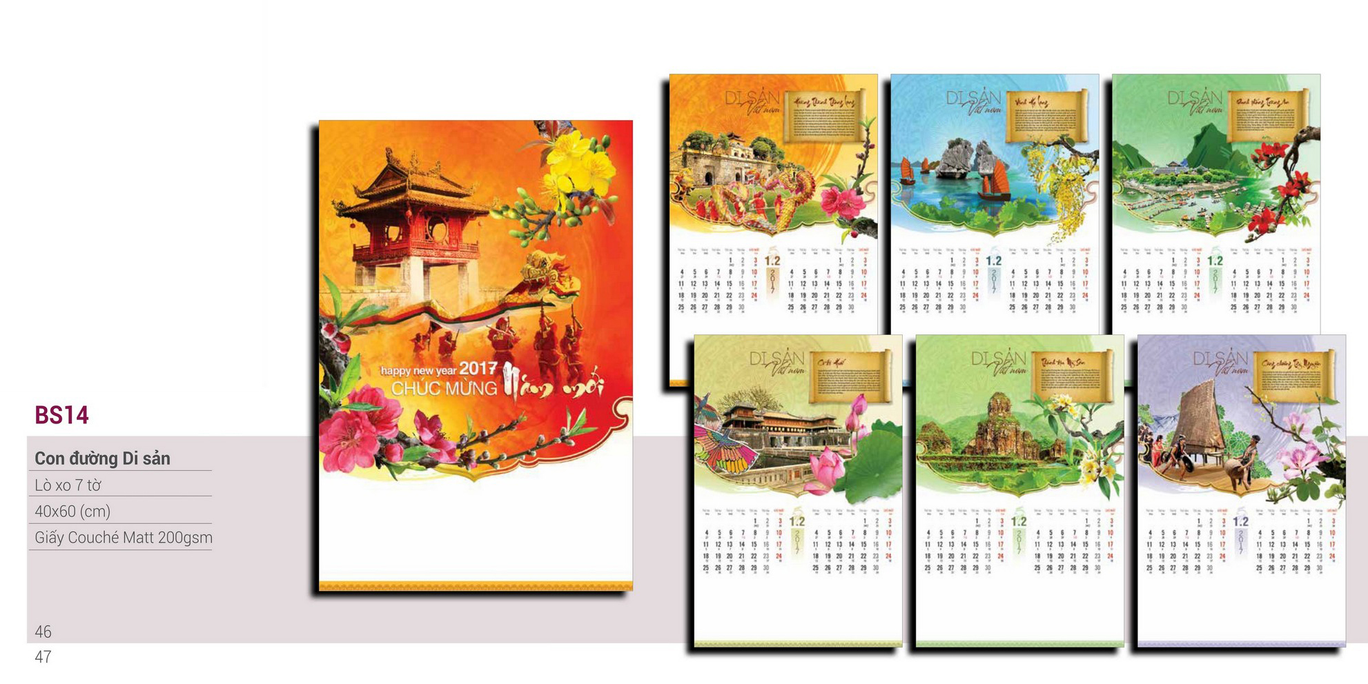 Lịch treo tường lò xo 7 tờ năm 2017 bao gồm 1 tờ bìa và 6 tờ ruột bên trong,mỗi tờ 2 tháng, những mẫu lịch lò xo 7 tờ 2017 được thiết kế theo nhiều mẫu có sẵn, nhiều chủ đề. Và lịch lò xo 7 tờ độc quyền theo ý riêng của quý khách.